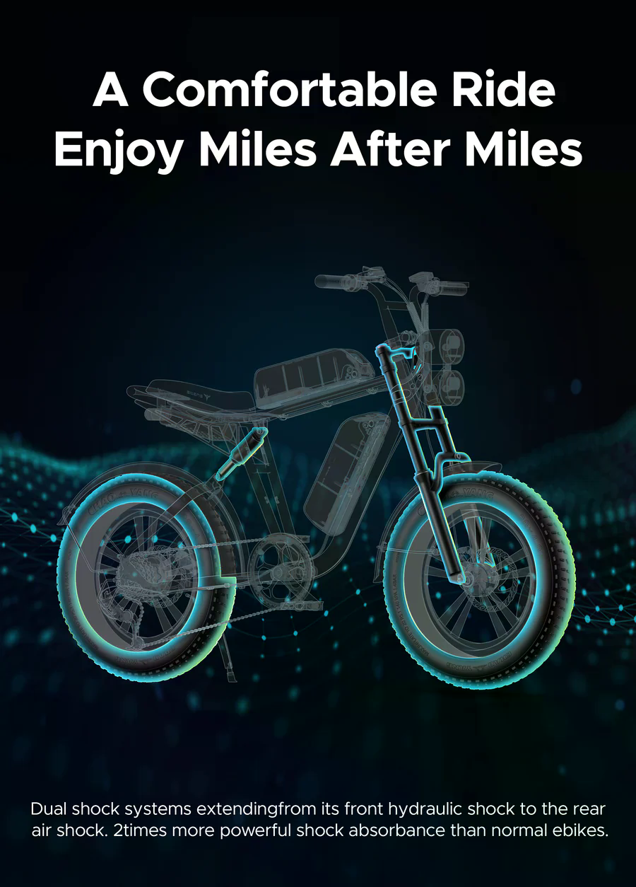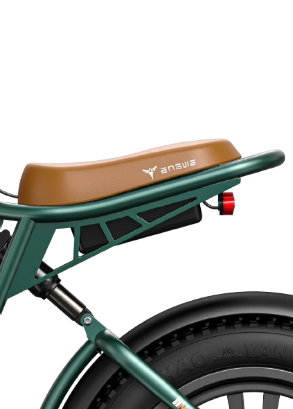 Das Design des ENGWE M20 zählt zu seinen größten Stärken. Es kombiniert eine retro-inspirierte Motorradoptik mit modernen E-Bike-Technologien und einer robusten Rahmenkonstruktion. Der Rahmen besteht aus einer widerstandsfähigen 6061-Aluminiumlegierung, die hohen Belastungen, Stößen und langfristigem Einsatz unter verschiedenen Bedingungen standhält. Während viele urbane E-Bikes auf ein minimalistisches und leichtes Design setzen, legt das M20 den Fokus auf Stabilität, Solidität und einen ausgeprägten Motorradcharakter. Die Abmessungen des Fahrrads betragen 167 cm Länge, 114 cm Höhe, 37 cm Reach, 115,2 cm Radstand und 76,2 cm Rahmenhöhe, was eine komfortable Sitzposition für die meisten Fahrer gewährleistet. Ein großes Highlight ist die Möglichkeit, einen zweiten Akku zu montieren, der im Rahmen integriert wird und dem Bike einen noch markanteren Moto-Look verleiht. Zur hochwertigen Ausstattung gehören eine vordere hydraulische Federgabel in Kombination mit hinteren Luftdämpfern, wodurch das E-Bike vollgefedert ist und sich auch für unebene Straßen eignet. Ein starkes vorderes LED-Licht sorgt für gute Sichtverhältnisse, die 20×4.0" Fat-Reifen bieten hervorragende Traktion und Fahrstabilität, während die mechanischen 160-mm-Scheibenbremsen vorne und hinten zuverlässige Bremsleistung garantieren. Ein weiterer Vorteil ist die 7-Gang-Schaltung, die eine flexible Anpassung des Fahrstils an unterschiedliche Bedingungen ermöglicht.
