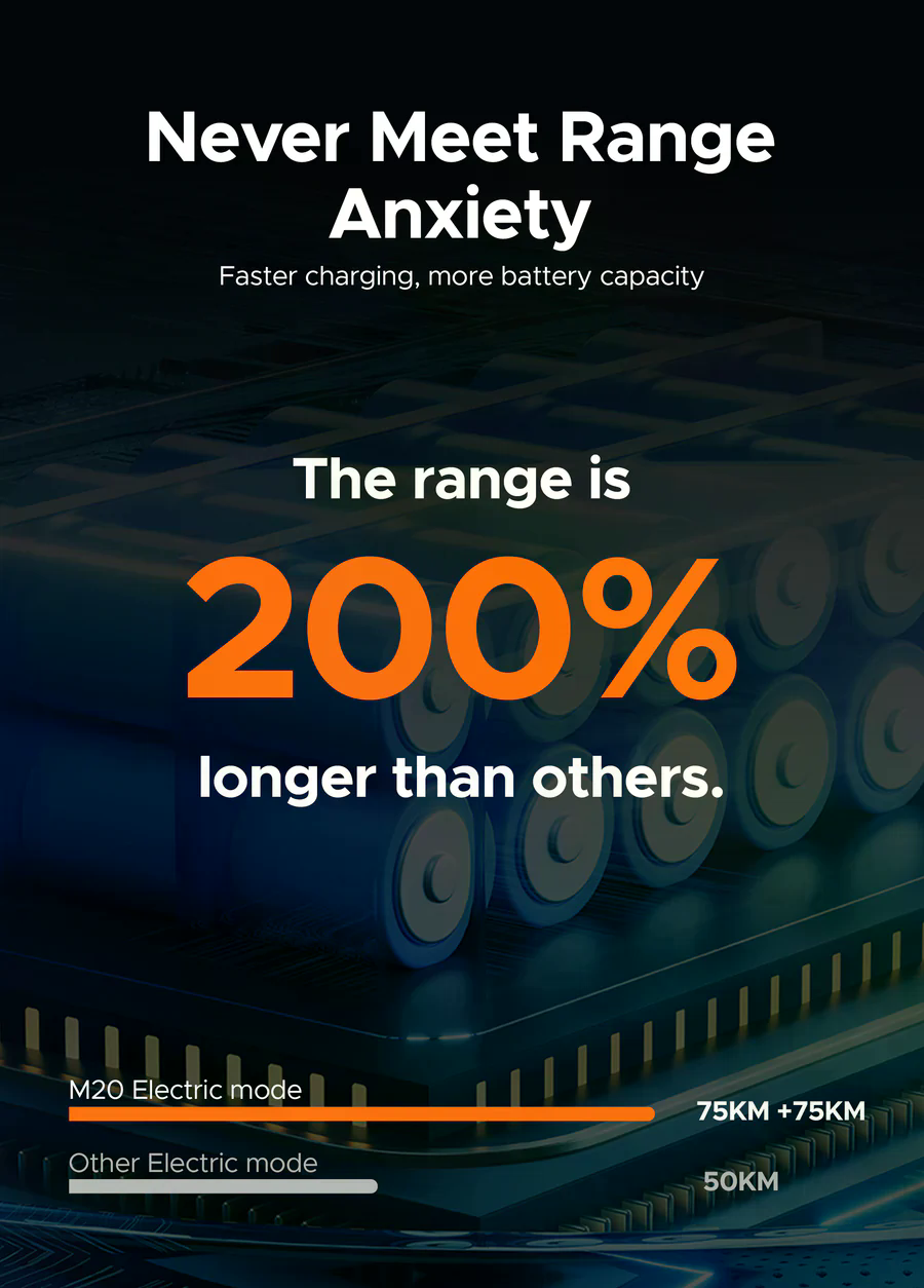Im Vergleich zu anderen Modellen der Marke ENGWE besitzt das M20 einen einzigartigen Charakter. Während Modelle wie das ENGWE EP-2 Pro oder das Engine Pro eher universelle, faltbare E-Bikes sind, richtet sich das M20 an Fahrer, die ein motorradähnliches Design, eine robuste Federung und die Möglichkeit zur Nutzung von zwei Akkus wünschen. Im Gegensatz zu faltbaren Modellen bringt es mit 34,8 kg zwar mehr Gewicht auf die Waage, bietet dafür jedoch eine höhere Stabilität. Im Vergleich zu den leistungsstärksten Modellen der Marke liegt der 750-W-/1000-W-Peak-Motor im Mittelfeld – nicht der schnellste, aber mit dem besten Verhältnis aus Leistung, Reichweite und Preis. Die Reichweite von 75–150 km übertrifft sogar einige teurere Modelle. Eine Tragfähigkeit von 120 kg, die Federung vorne und hinten, die 20×4.0 Reifen und der markante Rahmen verschaffen ihm einen klaren Vorteil gegenüber Modellen mit geringerem Fokus auf Design und Fahrerlebnis. Das ENGWE M20 stellt somit eine ideale Brücke zwischen urbanen E-Bikes, geländetauglichen Modellen und stilvollen Moto-E-Bikes dar.