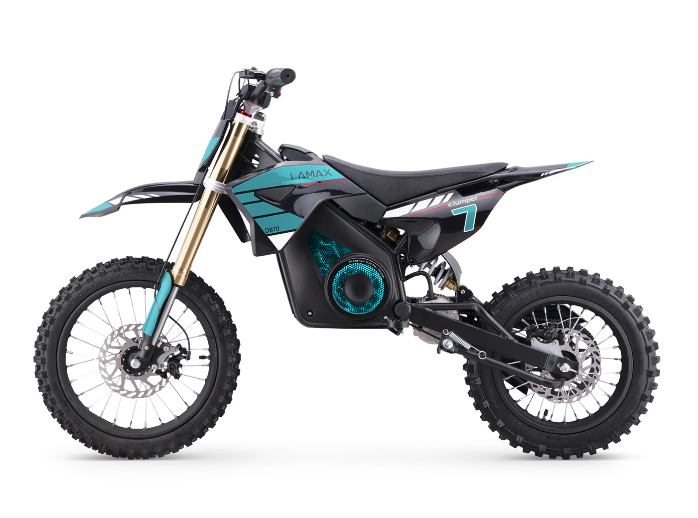 Das Design des LAMAX eJumper DB70 ist auf die Bedürfnisse von Kindern zugeschnitten, die ein stylisches und zugleich praktisches Elektromotorrad suchen. Der Stahlrahmen bietet Stabilität und Haltbarkeit, während die Kombination aus 14″-Vorderrad und 12″-Hinterrad mit luftgefüllten Reifen eine reibungslose Fahrt auch auf unebenem Gelände ermöglicht. Vordere Öldämpfer und hintere Federaufhängung erhöhen den Komfort und dämpfen Stöße bei Fahrten im Gelände oder auf Straßen mit schlechterem Belag. Das Motorrad ist mit zwei 180-mm-Scheibenbremsen ausgestattet, die ein sicheres Anhalten auch bei höheren Geschwindigkeiten gewährleisten. Der LAMAX eJumper DB70 verfügt über eine LCD-Batterieanzeige sowie die Möglichkeit, die Beschleunigung von 0,2 bis 1 Sekunde einzustellen, sodass die Leistung fein auf die Erfahrung des jungen Fahrers abgestimmt werden kann. Außerdem verfügt er über einen Kurzschlussschutz und ein Selbstbremssystem, das das Motorrad automatisch abbremst, wenn der Gashebel losgelassen wird, wodurch die Sicherheit während der Fahrt erhöht wird. Dieses Modell ist so konzipiert, dass es Funktionalität, modernes Aussehen und praktische Lösungen kombiniert, die sowohl Eltern als auch junge Fahrer zu schätzen wissen.