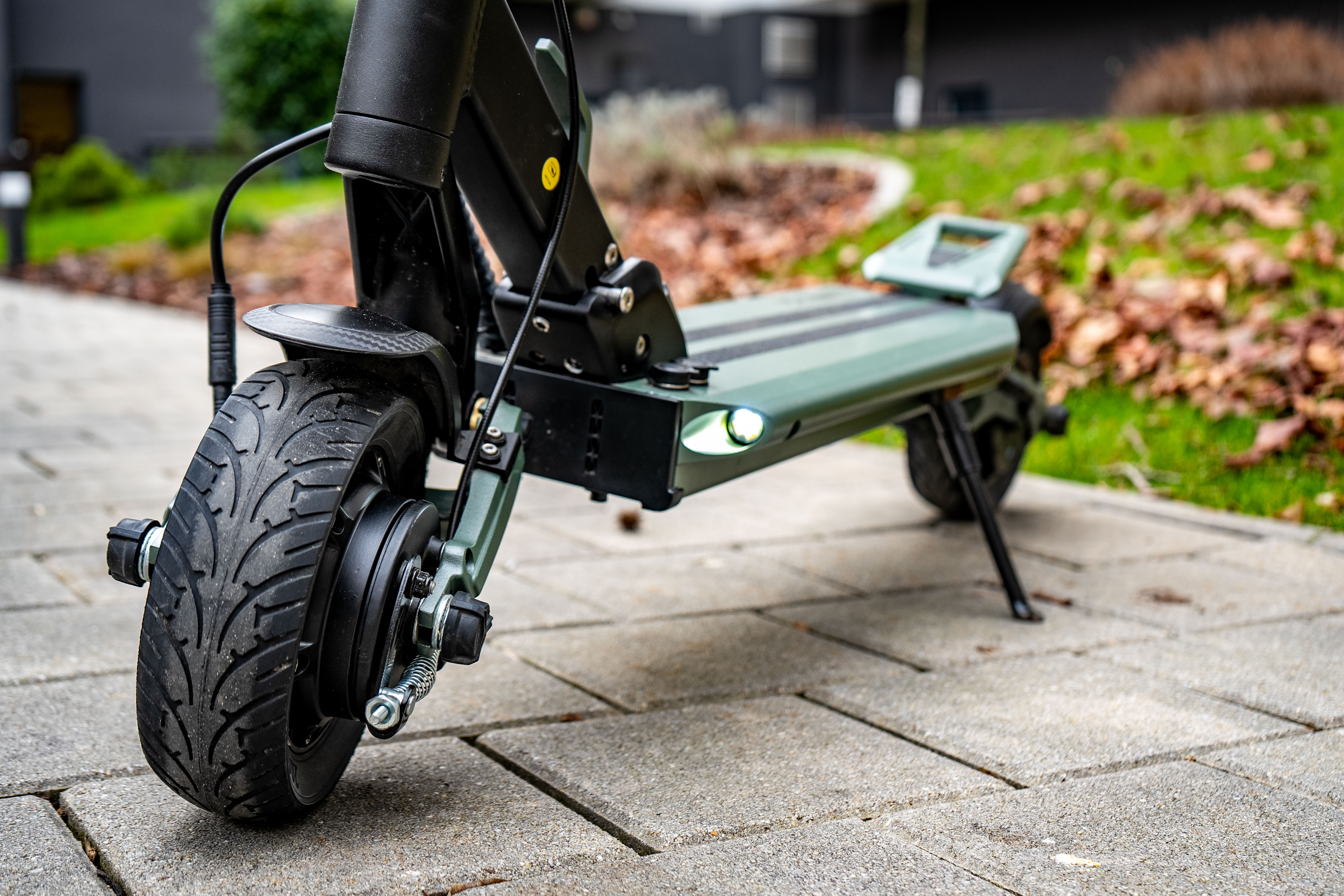 Aus dem Gelände kehren wir wieder in die Stadt zurück, wo das Potenzial des 8,5-Zoll Scoters Vsett 8+ voll zum Tragen kommt. Nicht nur das ansehnliche Design in grünen Farbtönen, sondern insbesondere die Wartungsfreiheit sind die Hauptvorteile dieser modernen Maschine.