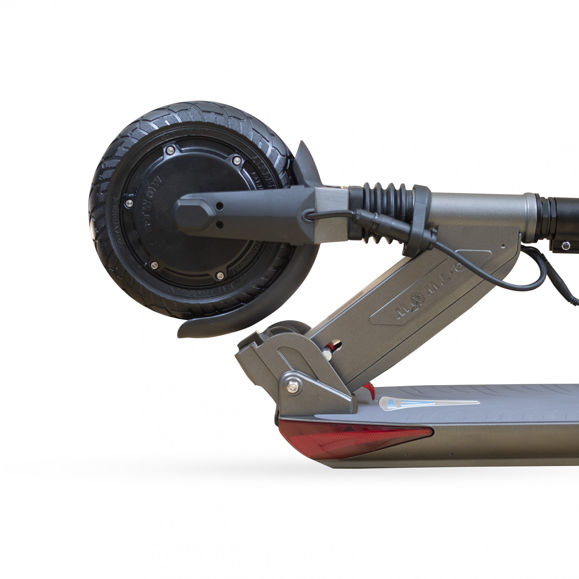 Viele Kunden haben Sorgen bei Scootern mit Vollreifen – wegen der weniger komfortablen Fahrt. Die ganze Reihe Booster von E-Twow nutzt jedoch Vollreifen aus patentiertem Material, das zwar nie so dämpfend wird wie ein Luftreifen, aber doch ein bisschen federt und insbesondere eine gute Haftung hat. Gerade diese Räder tragen überraschend zum Gesamtkomfort bei, weil sie nicht durchstochen werden können und Sie somit keinen Platten bekommen können. Als Fahrer erhalten Sie somit eine viel größere Sicherheit und Freude an der Nutzung, weil Sie wissen, dass Sie stets rechtzeitig ans Ziel kommen und an den Luftdruck in den Reifen nicht denken und auch keinen Platten fürchten müssen. Dies alleine an sich hat einen riesigen Wert, weil bei den Maßen der Räder von 8 Zoll die Platten bei Modellen mit den Luftreifen sehr oft vorkommen. Wenn Sie täglich fahren werden, sparen Ihnen diese Räder vielleicht auch einen Platten im Monat. E-Twow Booster V (Powero City) hat dazu noch gefedertes Vorder- und auch Hinterrad, was nicht nur den Komfort, sondern auch die Sicherheit steigert. Dank der Federung stürzen Sie vom Scooter nicht, wenn Sie zufällig ein Schlagloch oder eine andere Unebenheit treffen. Die vordere und auch die hintere Feder kann leicht ausgetauscht werden und wir halten sie auf Lager; ihren Austausch empfehlen wir nach ca. 3.000 km. Die hintere Feder hat verstellbare Vorspannung, sodass Sie diese an das Fahrergewicht anpassen und dadurch auch die Bodenfreiheit des Scooters ändern können. Zum Komfort tragen auch die automatische vordere Beleuchtung mit Sensor, übersichtliches Display, Tempomat, das extrem niedrige Gewicht und insbesondere die volle Wartungsfreiheit bei. Sie brauchen sich um nichts Sorgen zu machen, nur den Scooter aufzuladen und zu fahren. Sogar auch die Bremse ist elektromagnetisch, sodass Sie diese nicht nur nicht pflegen, einstellen oder die Bremsbeläge tauschen müssen, sondern wird sie Ihnen beim Bremsen auch noch die Batterie aufladen. Der Komfort der Fahrt selbst ist in dieser Gewichtskategorie überdurchschnittlich, auch wenn er natürlich mit den Modellen mit Luft- oder Öldämpfern nicht mithalten kann. Solche Modelle gibt es jedoch in dieser Gewichtskategorie nicht. Die absolute Spitze ist der Komfort des Besitzes bei diesem Scooter. Mit Ausnahme der Aufladung und eines gelegentlichen Kontrollservices braucht man nichts mehr. Zum Komfort trägt auch die höhenverstellbare Lenkstange bei, sodass der Scooter an Fahrer mit unterschiedlicher Größe angepasst werden kann und die gesamte Familie den Fahrspaß miterleben darf. Im Rahmen des Facelifts 2020 bekam dieser Scooter eine neue Silikonoberfläche der Plattform, die mit einem feuchten Tuch leicht gereinigt werden kann; insbesondere jedoch der völlig neue Klappmechanismus. Dieser trägt deutlich zum Komfort des Zusammenlegens bei, da er auch mit der Hand bedient werden kann. Verbessert wurden auch die Klappgriffe, die fester und bequemer sind.