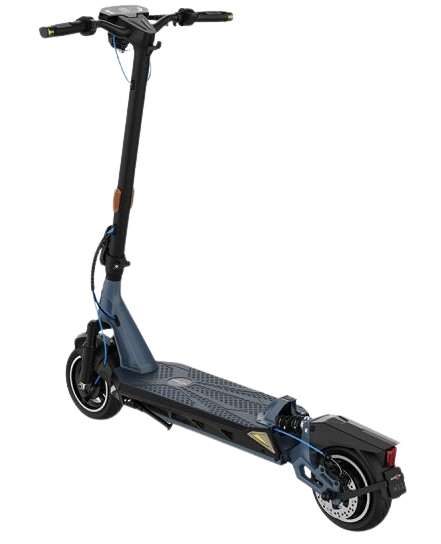 Das Design des KingSong N12 Pro verbindet robuste Technik mit moderner Eleganz. Die Abmessungen im ausgeklappten Zustand betragen 1295 × 645 × 1270 mm, im zusammengeklappten Zustand 1295 × 645 × 610 mm, was den Transport und die Aufbewahrung – etwa im Kofferraum oder unter dem Schreibtisch – erleichtert. Der Rahmen aus Aluminiumlegierung ist für hohe Belastbarkeit, täglichen Einsatz und Vibrationsbeständigkeit ausgelegt. Der Scooter fährt auf 10-Zoll-Reifen, die zusammen mit der vorderen und hinteren Federung (Dual Suspension) Stöße abfedern und eine angenehme Fahrt selbst auf unebenen Straßen gewährleisten. Der N12 Pro ist mit einem intelligenten LCD-Display ausgestattet, das Geschwindigkeit, Akkustand, Fahrmodus und weitere Informationen anzeigt. Über Bluetooth und die mobile App können Sie Fahrdaten abrufen, Einstellungen ändern, den Scooter sperren oder den Diebstahlalarm aktivieren. Zur Ausstattung gehören außerdem ein vorderes LED-Licht, ein hinteres Bremslicht, Blinker sowie eine RGB-Ambientbeleuchtung am Trittbrett. Ein praktischer Faltmechanismus ermöglicht das Zusammenklappen innerhalb weniger Sekunden. Jeder Aspekt – von ergonomischen Griffen bis zur rutschfesten Trittfläche – wurde für maximalen Komfort und Sicherheit konzipiert.