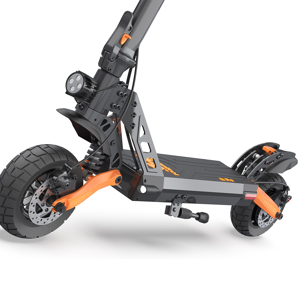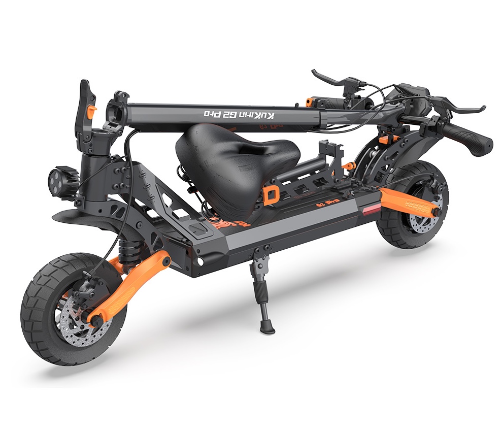 Der KuKirin G2 Pro beeindruckt auf den ersten Blick durch sein sportliches Design, das moderne Linien mit praktischen Details kombiniert. Er ist ausgestattet mit einstellbarem Lenker, Klappmechanismus für einfache Lagerung und abnehmbarem Sitz, was Flexibilität je nach Fahrerpräferenz bietet. Der Fahrkomfort wird durch Vorder- und Hinterradfederung mit 4-Arm-System gewährleistet, die Unebenheiten teilweise ausgleicht und auch auf weniger gutem Untergrund eine angenehme Fahrt ermöglicht. Für sicheres Bremsen sorgen 120-mm-Scheibenbremsen vorne und hinten, die auch bei höheren Geschwindigkeiten ausreichend Bremskraft bieten. Ein bedeutender Vorteil ist die Beleuchtung – der Scooter ist mit bis zu sechs Lichtern ausgestattet, darunter LED-Scheinwerfer vorne, Seitenlichter und Bremslicht hinten. Blinker, Hupe und Tempomat sind ebenfalls verfügbar, um das Fahren komfortabler zu gestalten. Das farbige LCD-Display zeigt alle wichtigen Daten an, wie Geschwindigkeit, Batteriestatus und gefahrene Kilometer. Der Scooter verfügt außerdem über Schutzklasse IP54, wodurch er staub- und spritzwassergeschützt ist, was die Lebensdauer und Vielseitigkeit erhöht.