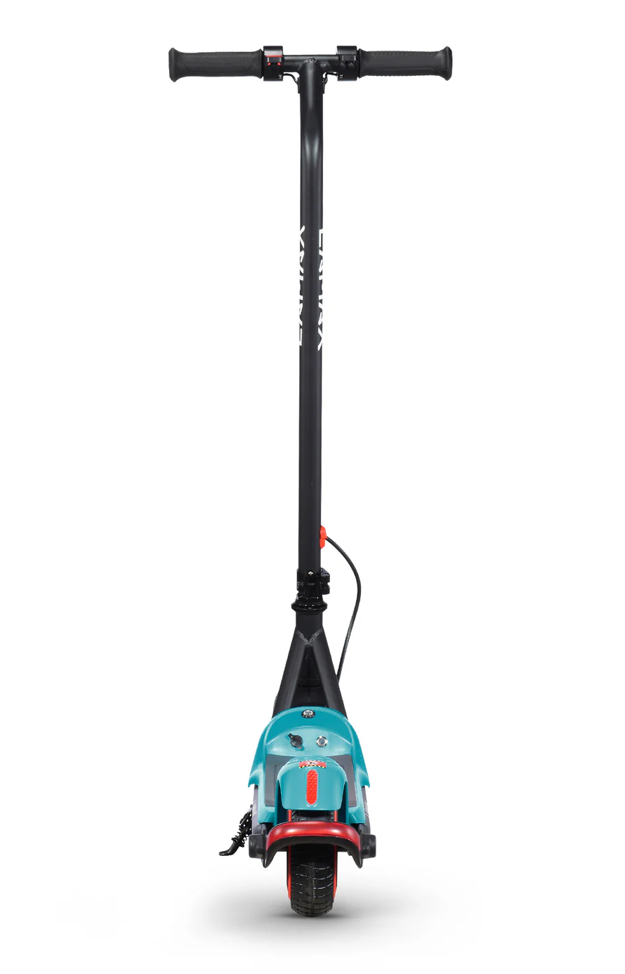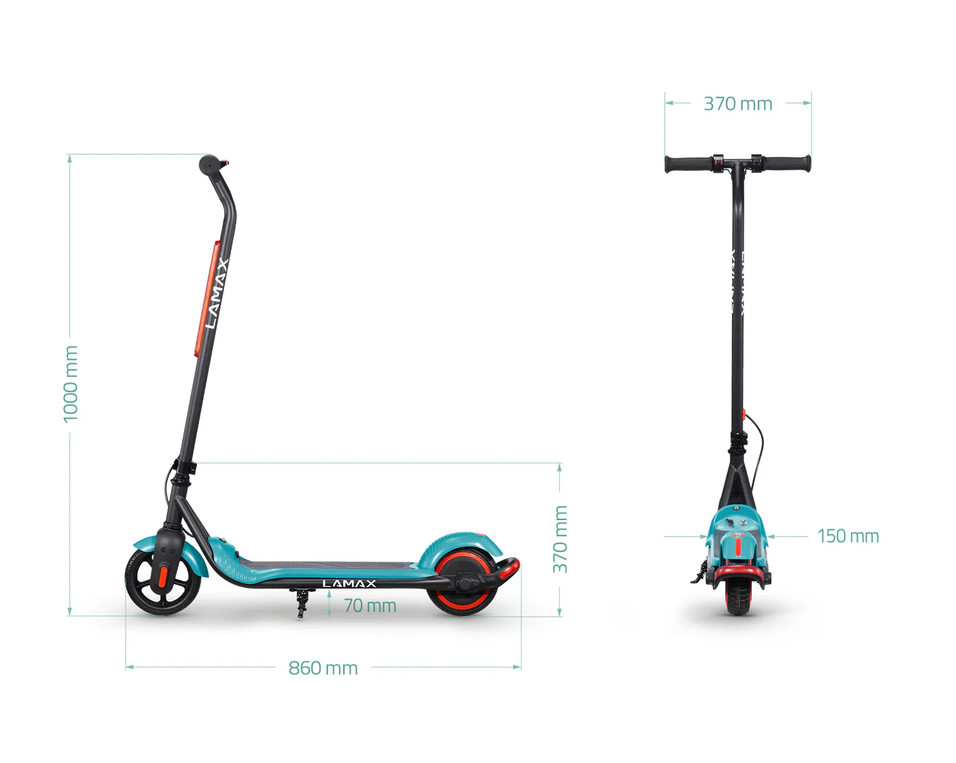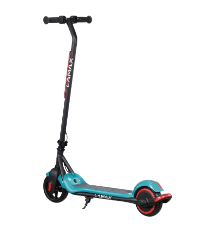 Der LAMAX eFlash SC20 fällt auf den ersten Blick durch sein attraktives Schwarz-Türkis-Design auf, das frisch und sportlich wirkt. Der Roller hat im ausgeklappten Zustand kompakte Abmessungen von 88 × 100 × 37 cm, wodurch er sich für Kinder eignet und zugleich praktisch zu tragen oder zu verstauen ist. Der Stahlrahmen ist stabil und langlebig, zugleich aber leicht, sodass ein Kind den Roller anheben oder versetzen kann. Die 6,5-Zoll-Räder bestehen aus robustem, perforiertem Material, das das Risiko von Reifenpannen eliminiert und keine Wartung wie Luftreifen erfordert. Der Roller bietet eine vordere LED-Beleuchtung für bessere Sicht bei schlechten Lichtverhältnissen sowie ein hinteres Bremslicht, das andere Verkehrsteilnehmer beim Abbremsen warnt. Eine praktische Funktion ist der klappbare Lenkmechanismus, der ein schnelles Zusammenklappen und einfaches Verstauen ermöglicht. Die „Zero-Start“-Sicherheitsverriegelung sorgt dafür, dass der Roller nicht von selbst losfährt – der Motor aktiviert sich erst nach dem Abstoßen, was für Kinder sicherer ist. Auf dem Cockpit befindet sich eine LED-Akkuanzeige, die klar zeigt, wann geladen werden muss. Im Lieferumfang ist alles enthalten: der Roller selbst, ein Ladegerät, ein Schraubenset, Werkzeug und eine Anleitung. Mit diesem Komplettpaket können Kinder sofort losfahren und Eltern haben die Gewissheit, dass nichts fehlt.