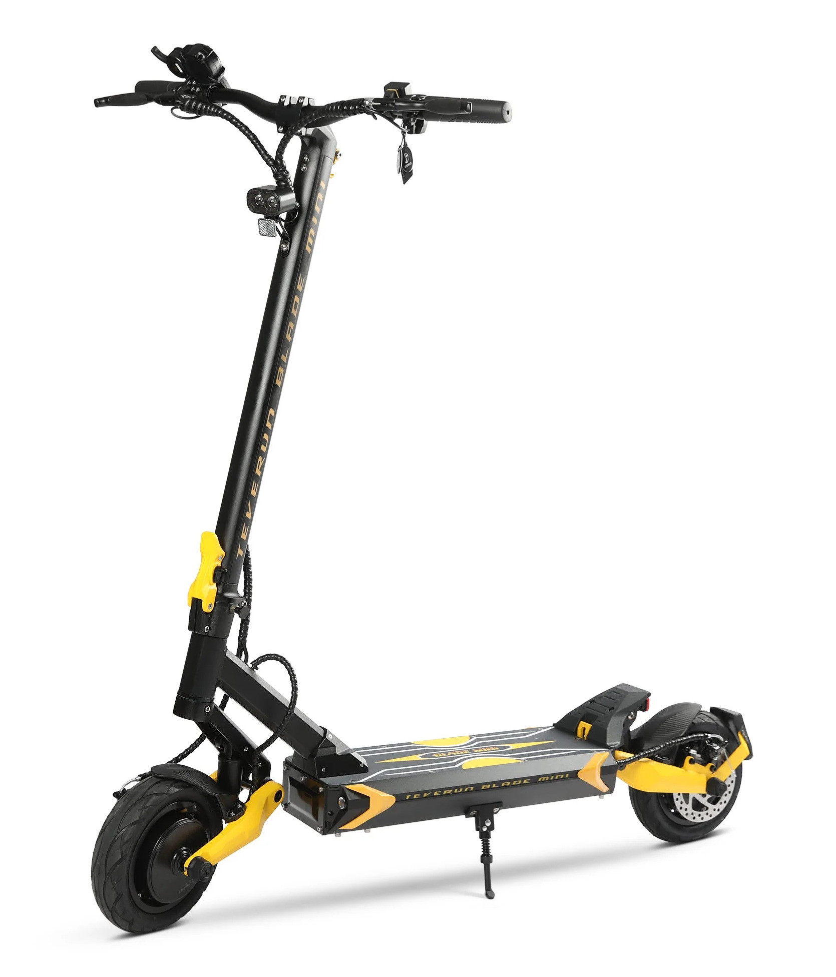 Von den städtischen Prämienscootern gehört der Teverun Blade Mini Pro an die absolute Spitze. Nur wenige Modelle dieser Kategorie haben solch feste Verarbeitung, komfortables Fahrwerk und moderne Ausstattung. Geben Sie die Version Pro mit der Leistung von zwei Motoren dazu und Sie werden auf dem Weg zur Arbeit, zur Schule oder ins Café von keinem Hindernis aufgehalten. Erfreulich ist auch seine praktische Seite bei der alltäglichen Nutzung. Die Maße betragen nach dem Zusammenklappen nur 118 x 60 x 65 cm (Länge, Höhe, Breite); deswegen können Sie ihn problemlos unter dem Bett verstauen oder am Arbeitstisch ablegen. Keine anstrengenden Momente beim Tragen wird auch sein Gewicht bringen, wo Sie seine 29 kg leicht in einen Aufzug tragen oder in den Kofferraum eines Autos verstauen können.