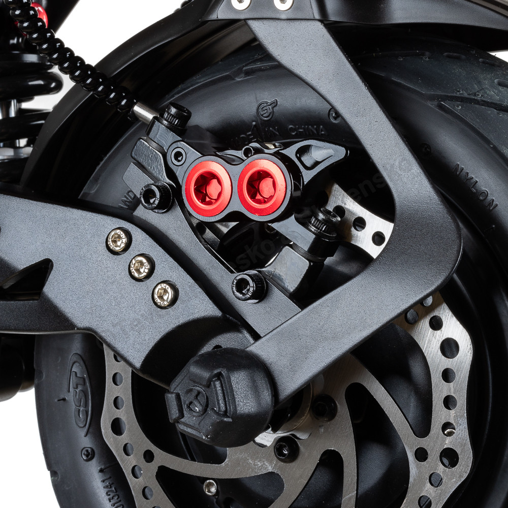 Teverun Fighter Supreme Ultra (8000 W) legt einen großen Wert auf die Sicherheit, was bei seiner extremen Leistung und bei den Geschwindigkeiten, die bis zu 100 km/h erreichen (nach dem Entsperren) notwendig ist. Der Scooter ist mit hydraulischen Scheibenbremsen mit vier Kolben ausgestattet, die für eine außerordentliche Bremskraft und einen kurzen Bremsweg sorgen, wodurch die Fahrtsicherheit auch bei höheren Geschwindigkeiten erhöht wird. Der Lenkungsdämpfer, der Bestandteil der Grundausstattung ist, minimiert die unerwünschten Vibrationen und sorgt für eine bessere Stabilität der Lenkung auch bei plötzlichen Manövern. Die leistungsstarke LED- Beleuchtung, einschließlich des vorderen Scheinwerfers, der Rückleuchten und Richtungsanzeiger, sorgt für maximale Sichtbarkeit auch bei erschwerten Sichtverhältnissen. Die 11-Zoll schlauchlose Reifen mit Schutz gegen Durchstechen erhöhen die Sicherheit dadurch, dass sie das Risiko eines Plattreifens bei der Fahrt im unterschiedlichen Gelände minimieren. Das intelligente Steuersystem der Batterie (Smart BMS) verfolgt ständig ihren Zustand, wodurch das Erhitzen, Überladen oder übermäßiges Entladen verhindert, ihre Sicherheit erhöht und das Risiko technischer Störungen gemindert wird.