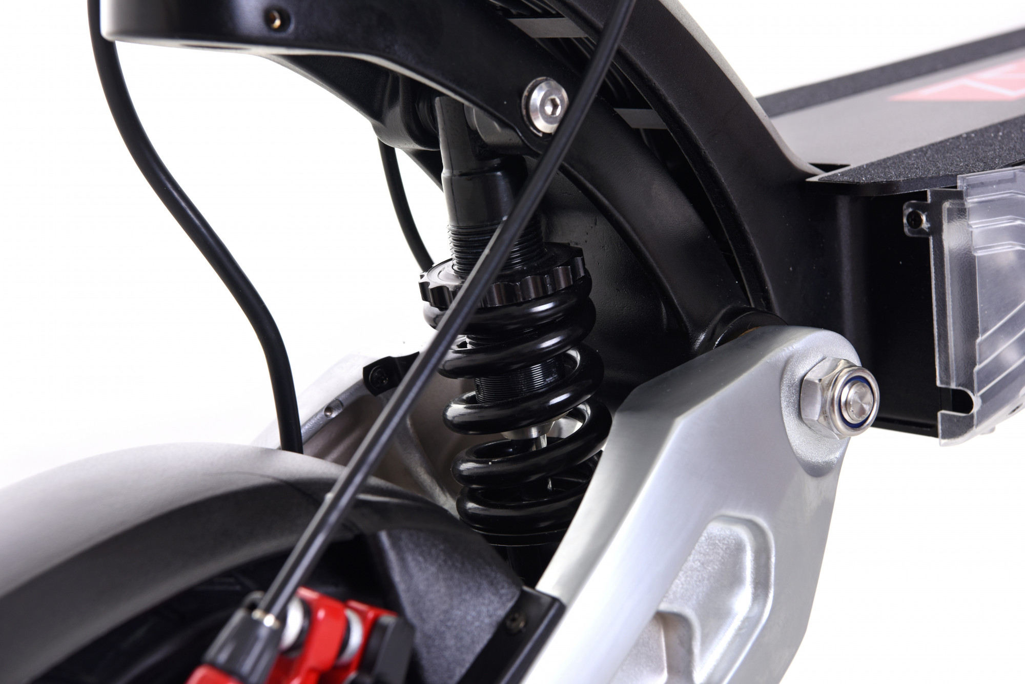Komfort8X hat zwei hydraulische Stoßdämpfer, kombiniert mit einer Feder, was aus ihm einen sehr komfortablen Scooter gemacht hat. Sein Komfort ist immer noch phantastisch, auch wenn wir den 10X für noch komfortabler halten, da der 8X kleinere 8 Zoll Räder mit Vollreifen hat. Der Vorteil liegt darin, dass Sie mit ihnen keinen Platten bekommen können, was natürlich zum Wohlbefinden und dem guten Gefühl beiträgt, dass Sie nichts regeln müssen; der Komfort leidet jedoch ein bisschen. Das Fahrwerk werden Sie bei der Fahrt in der Stadt schätzen, wenn er beinahe unglaublich unsere zerschlagene Straßen absorbiert, aber auch im Gelände, wo er auch mit der Fahr auf einer wirklich schlechten Oberfläche kein Problem hat. Das Fahrwerk ist dazu noch einstellbar, sodass Sie es bei einer schnellen Fahrt, bei der eine härtere Einstellung einen Vorteil bedeutet, härter mache können und das Fahrwerk stößt nicht an die Anschläge , was nicht nur zum Komfort, sondern auch zur Sicherheit beiträgt. Sie können es Ihrem Gewicht und Ihrem Fahrstil anpassen. Die Möglichkeit einer Anpassung der Festigkeit des Fahrwerks ist auch deswegen phantastisch, weil Sie mit ihr gleichzeitig die Bodenfreiheit ändern - je nach Verwendung – höher im Gelände und niedriger und komfortabler außerhalb des Geländes.
